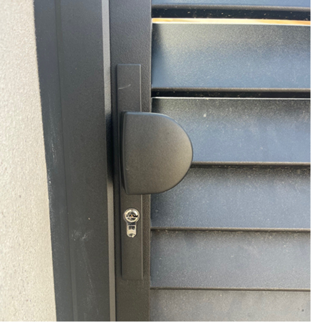 En complément du portail, WEISZ a installé un portillon assorti, modèle Sarlande également, avec ouverture à vantail unique vers l’intérieur. Il est équipé d’une poignée de tirage extérieure en aluminium et d’une gâche électrique, permettant un déverrouillage confortable depuis l’intérieur de l’habitation.