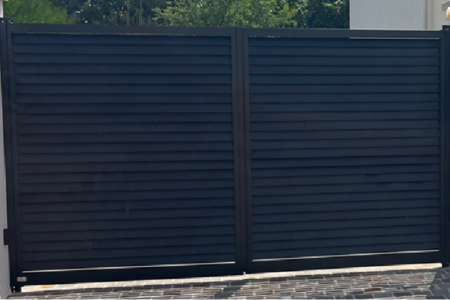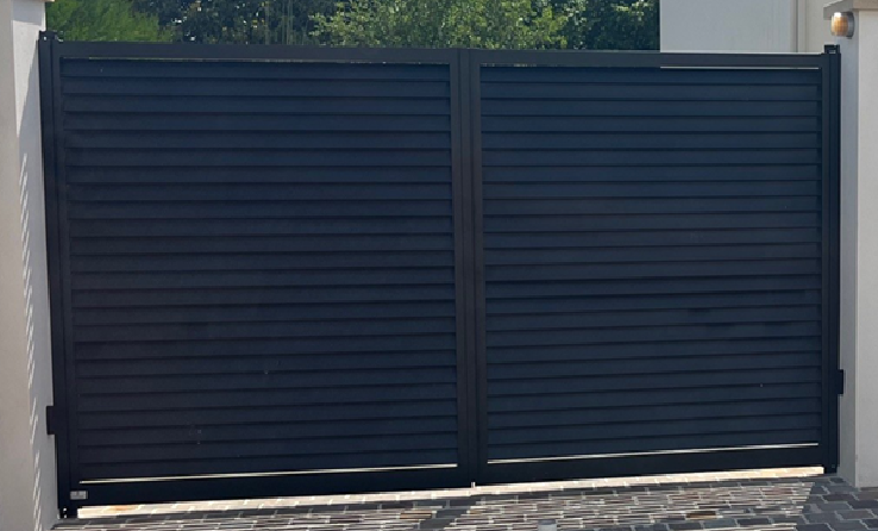 Le portail sélectionné est un modèle Sarlande à deux vantaux égaux, en aluminium soudé, avec une finition gris anthracite RAL 7016. Sa forme droite et ses lames inclinées à 30° assurent à la fois un design contemporain et une meilleure prise au vent – un choix judicieux pour les zones exposées.