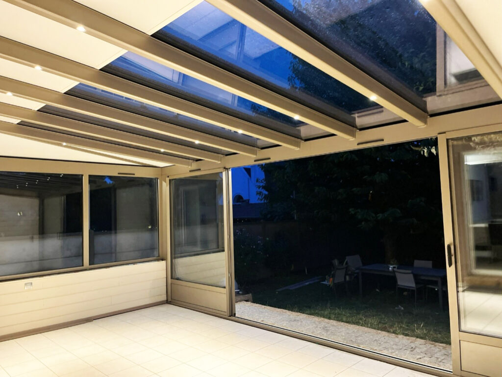 Des éclairages LED intégrés en périphérie de toiture viennent souligner l’architecture de la véranda et prolonger son usage jusque tard dans la soirée.